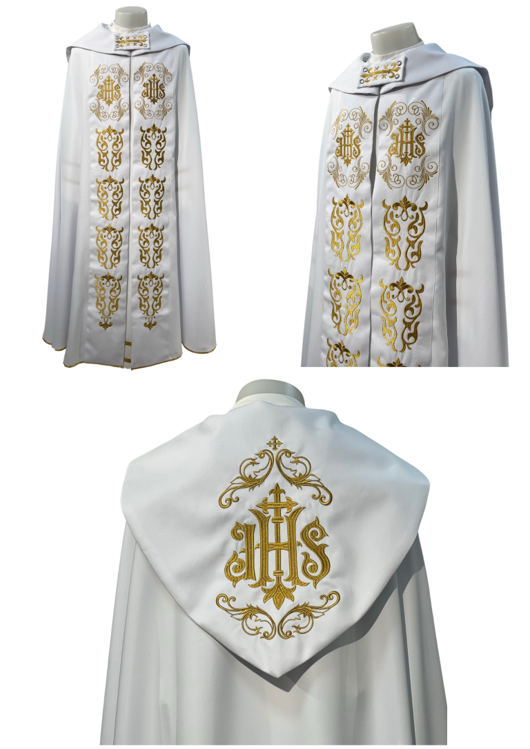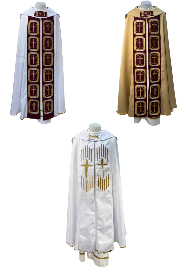 The cope is a liturgical cloak used during processions, solemn ceremonies, and other non-Mass liturgical celebrations.