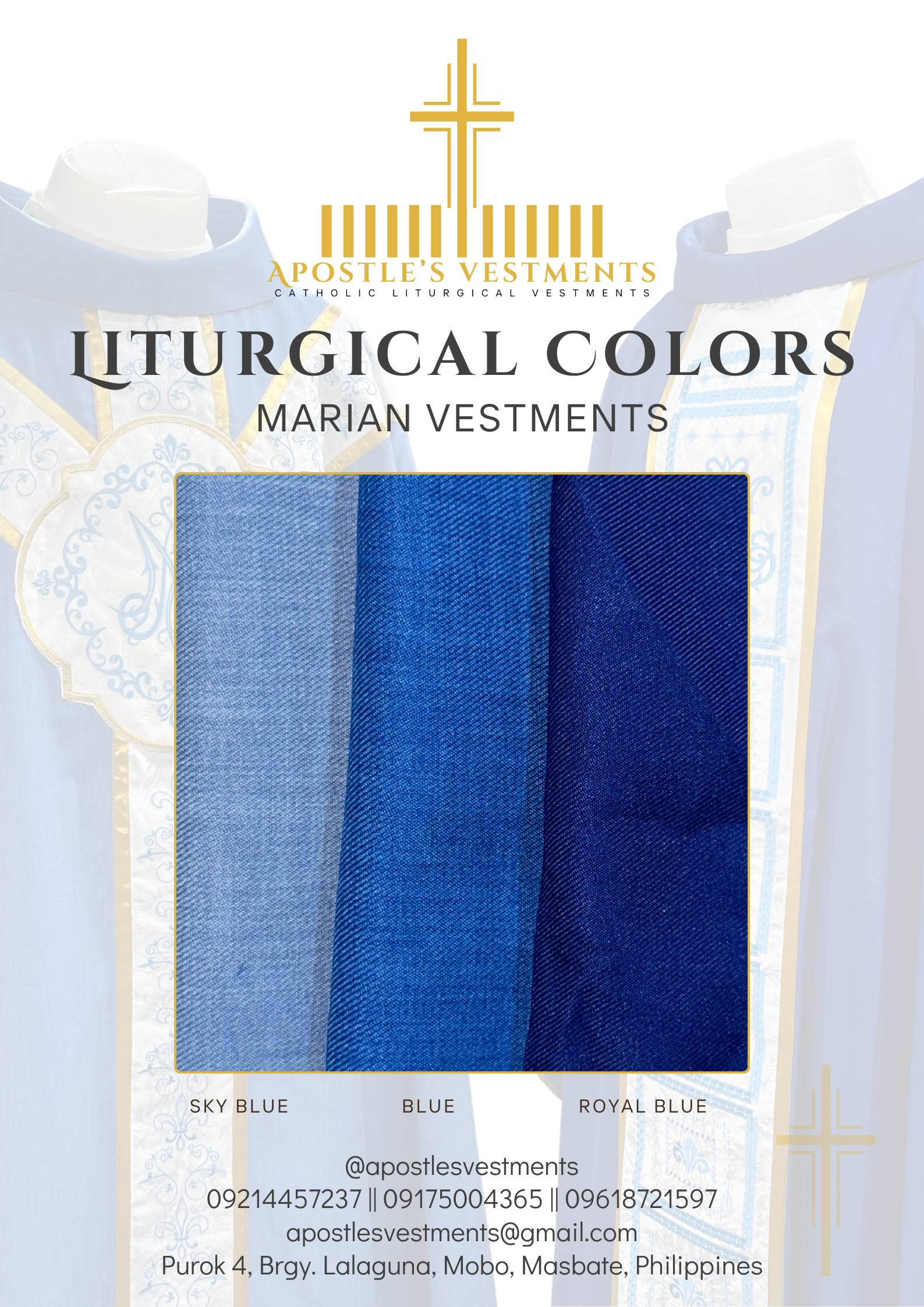 Blue, though not a standard color in the liturgical cycle, has been embraced in various cultural contexts as a symbol of the heavenly and the divine, particularly in Marian devotion, highlighting the universal appeal of the Virgin Mary across different liturgical traditions.