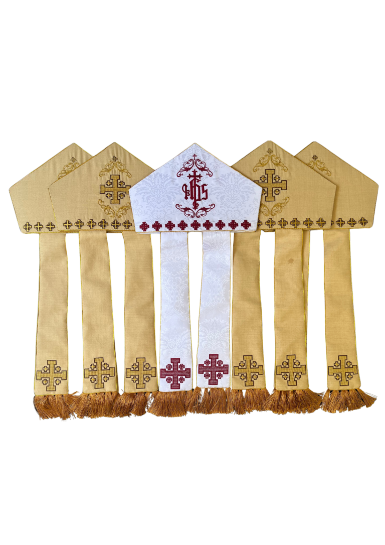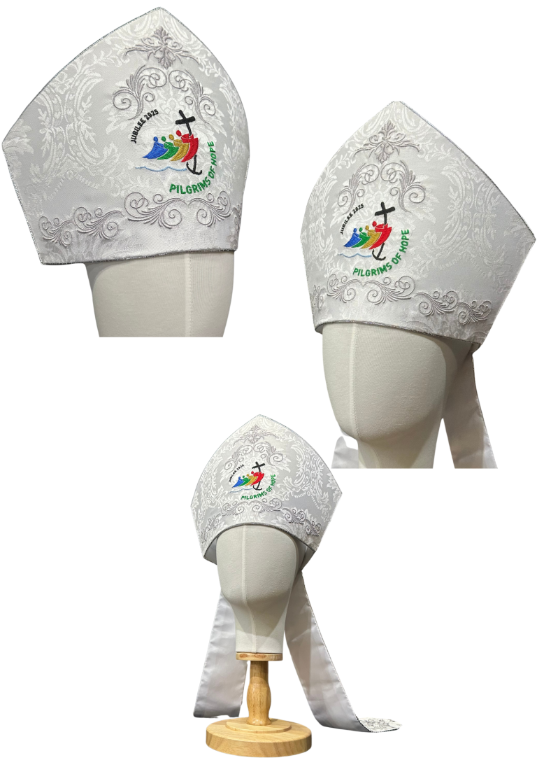 The mitre is a ceremonial headdress worn by bishops (and, in some contexts, abbots) during liturgical functions. It symbolizes the bishop’s authority, teaching role, and pastoral responsibility as a successor to the apostles. The distinctive shape of the Mitre, with its pointed top and often richly decorated design, represents both the heavenly crown of glory and the duty to guide the faithful with wisdom and dignity.