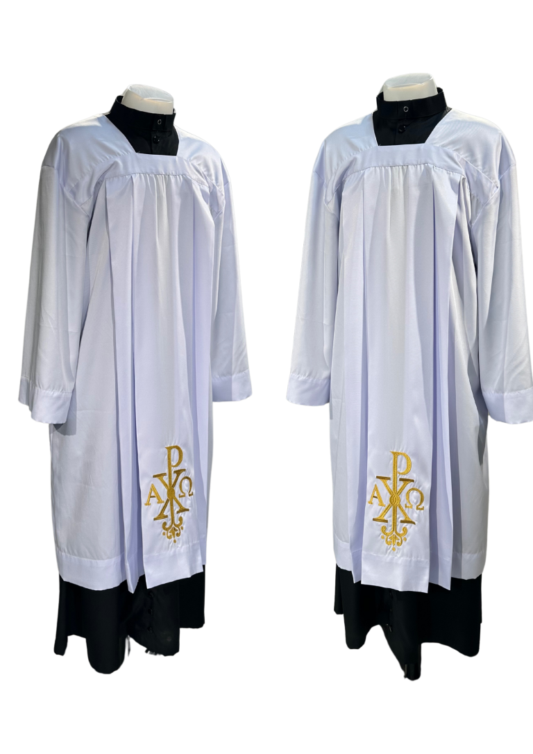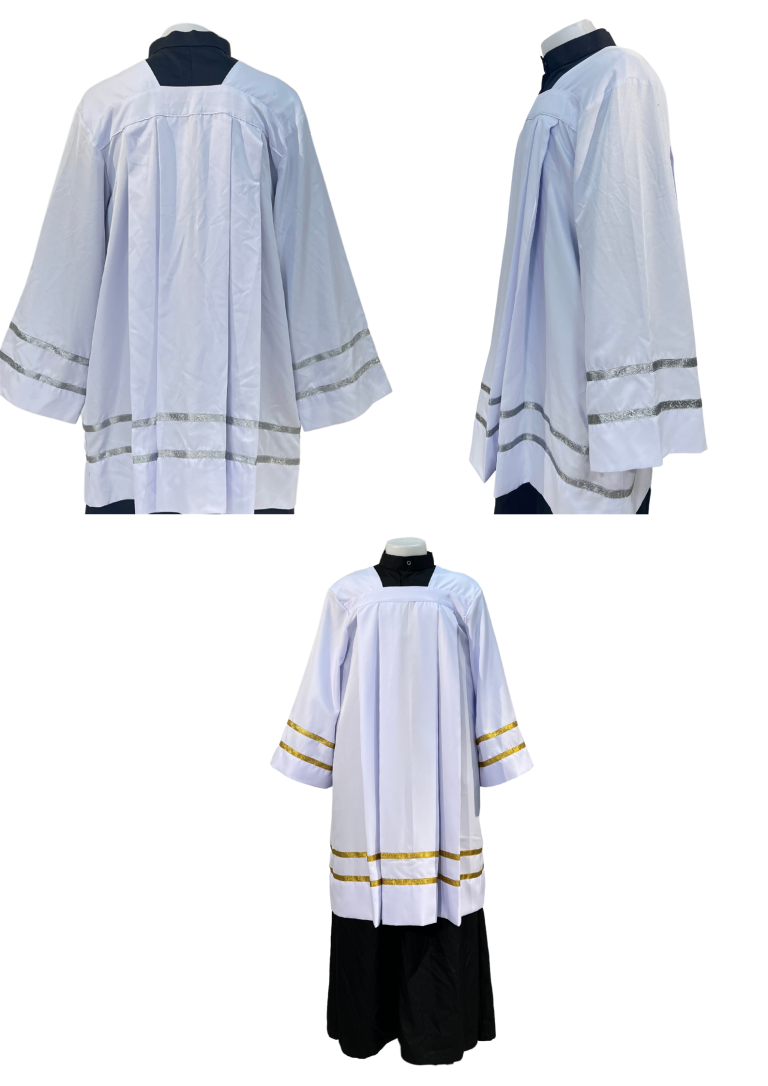 The surplice is a white, loose-fitting garment worn over the cassock, primarily for non-sacramental functions such as choir dress or other liturgical services where a more formal appearance is desired. It underscores the purity and formality of the service, providing a distinct visual marker that separates ordinary clerical attire from the celebratory vestments of the Mass.